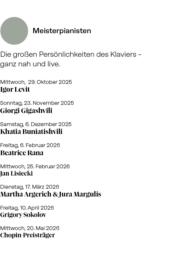 Alle Konzertreihen von Russ Klassik sind auch im Abonnement buchbar. Sie erhalten die Karten für alle Konzerte der gewählten Reihe zu einem Paketpreis, der bis zu 44 % günstiger ist als die Einzelkartenpreise. Für Ihr Abonnement können Sie aus den Platzkategorien I – V wählen. Preise und Platzkategorien finden Sie hier.